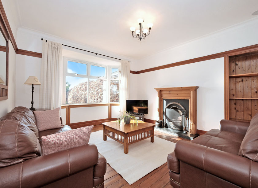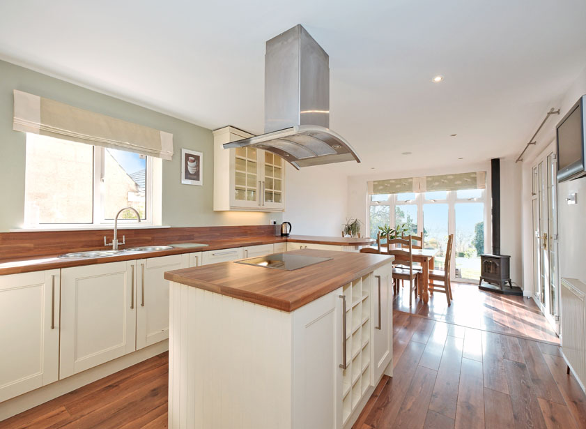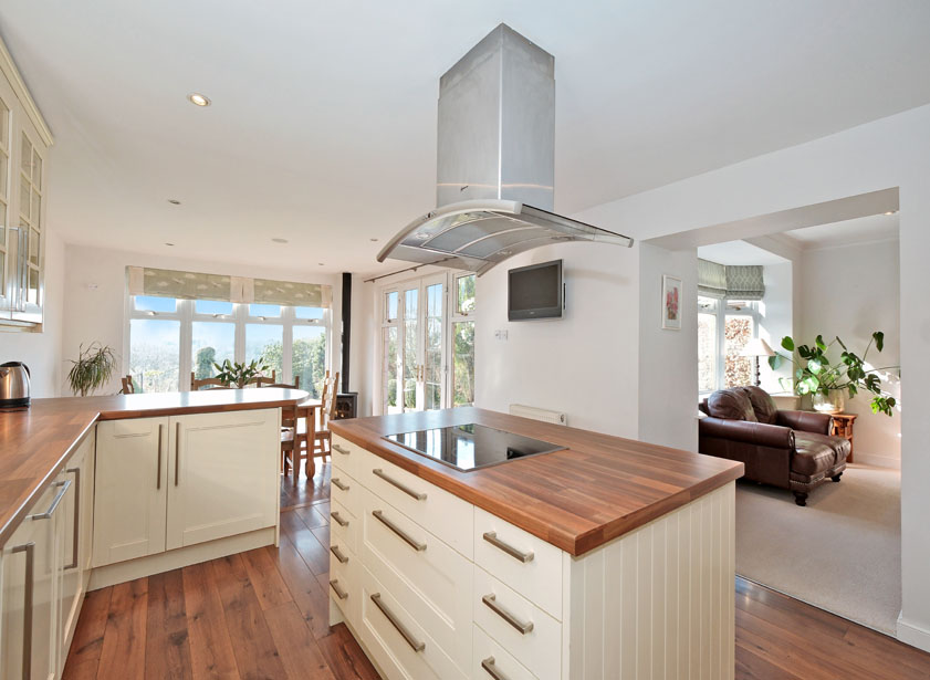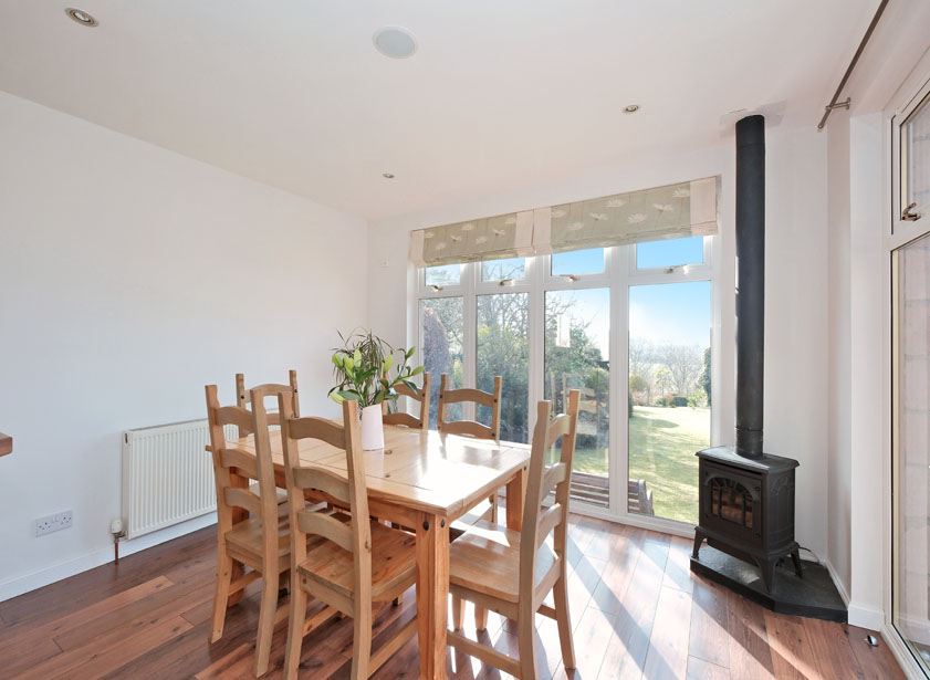 Boasting a superb open plan layout on split level, the well-appointed kitchen/dining area is fitted with a wide range of quality wall and base units in a contemporary shaker style. Ample worksurfaces with matching upstands incorporating stainless steel bowl sink and drainer. The integrated appliances include a combi oven, further oven/grill, larder fridge, larder freezer and dishwasher. A central island houses additional storage and induction hob with extractor canopy overhead. The exceptionally light and airy dining area offers ample space for a family table and chairs. A full height picture window overlooks the mature gardens and superb south facing views. Double French doors lead to the large, paved terrace. A particular feature of this room is the attractive gas stove with exposed flue set on a slate hearth.