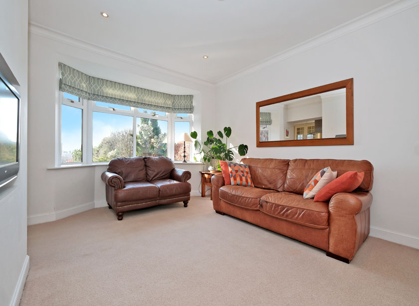 An arch from the kitchen/dining area leads to the spacious family room with bay window overlooking the terrace and garden grounds beyond. This room enjoys superb south facing views of the surrounding Dee Valley. A recessed alcove houses the wall mounted TV which will be included in the sale.