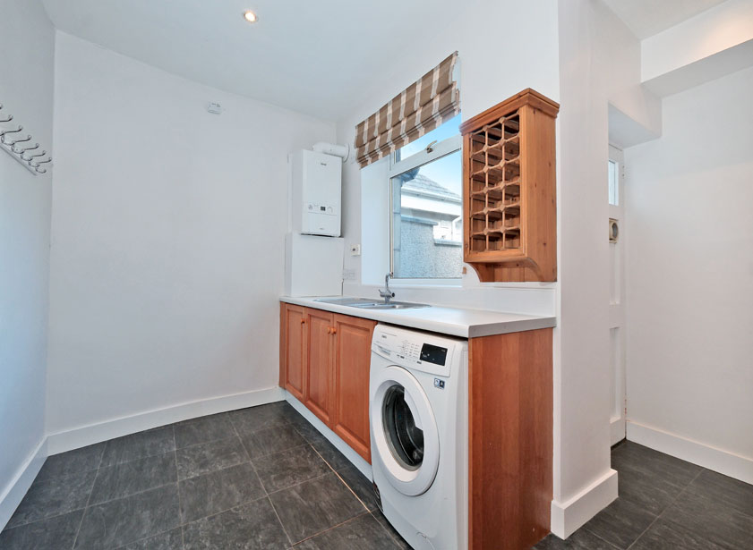 A good sized laundry room is fitted with additional wall and base units, ample worksurface incorporates a 1.5 bowl stainless steel sink with mixer tap and drainer. Space for free standing washing machine and tumble drier which will be included in the sale. Wall mounted Central heating boiler. A fitted cupboard houses the electricity circuit breaker. Window to the front and hardwood door to side courtyard area.