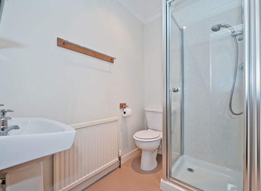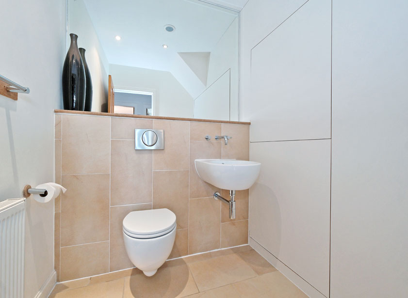 Completing the ground floor, a centrally set cloakroom is fitted with a white two piece comprising suspended w/c and wash hand basin. Tiled to dado height behind sanitary ware and ceramic tiled floor. Extensive fitted cupboards house the hot water cylinder and under stair storage facilities.