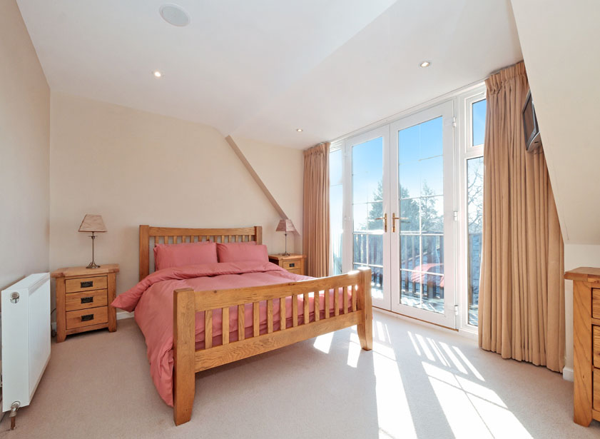 Of generous proportions the main double bedroom boasts double French doors with full height window to either side leading to the south facing timber balcony which offers superb open views of the surrounding Dee Valley. A double fitted wardrobe with sliding mirrored doors provides ample shelf and hanging space. This room is further enhanced by an ensuite bathroom. Fitted with a modern white three piece suite comprising w/c, suspended wash hand basin, bath with Grohe shower over and glazed screen alongside. Fully tiled around the bath/ shower area and to dado height behind sanitary ware. Large Velux window to the front.