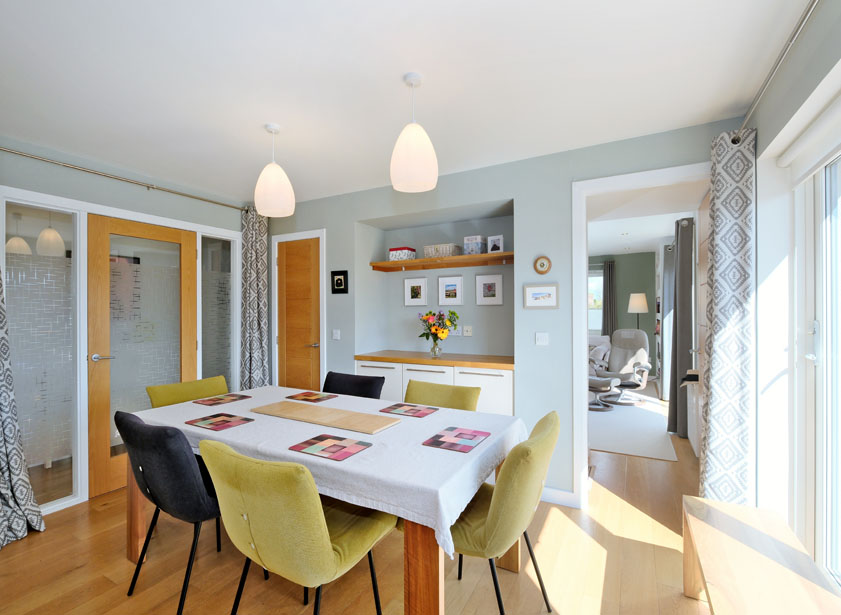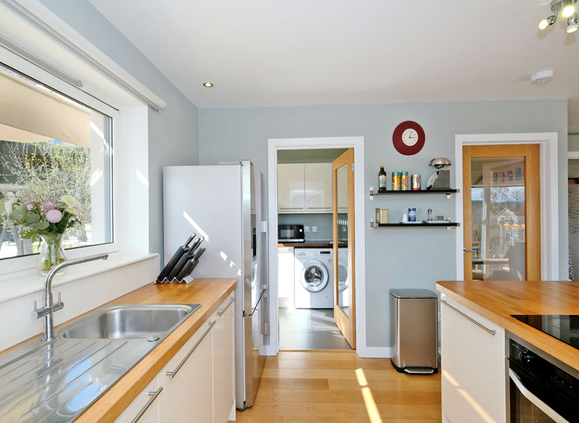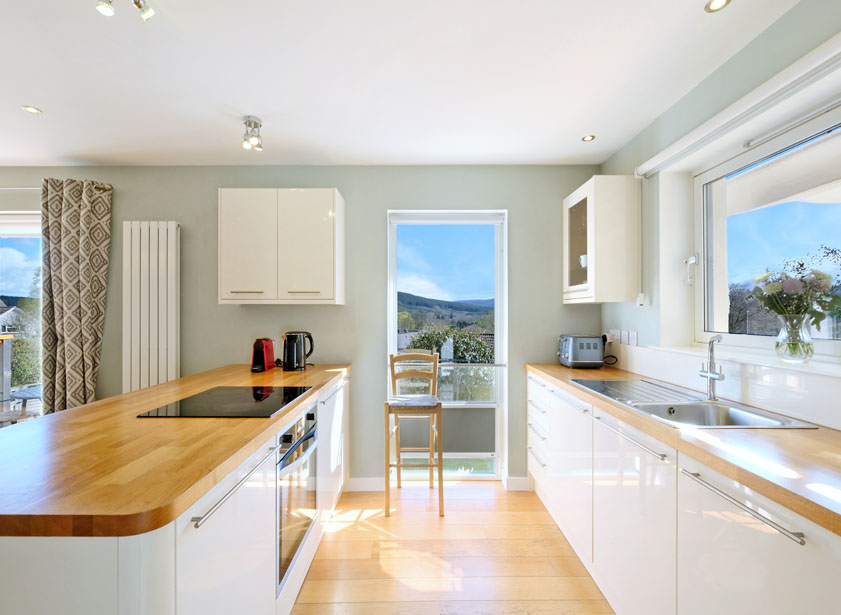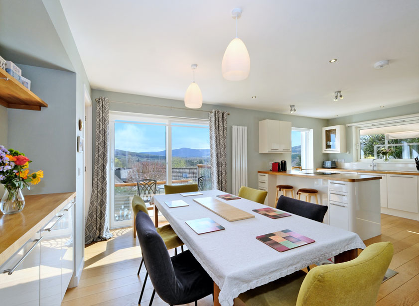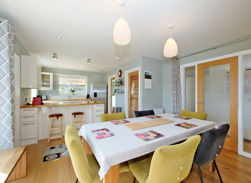 The bright dining kitchen accessible from the lounge and the hall again has spectacular views over the surrounding countryside via sliding doors and two windows in the kitchen. Fitted with a good range of modern gloss base and wall units, extensive solid woodwork surfaces, incorporating a stainless steel sink with drainer and a four ring induction hob. There is an integrated electric oven, dishwasher, and space for a freestanding fridge freezer. A breakfast bar area provides space for informal dining while there is ample space for dining furniture. A storage cupboard provides extra storage.