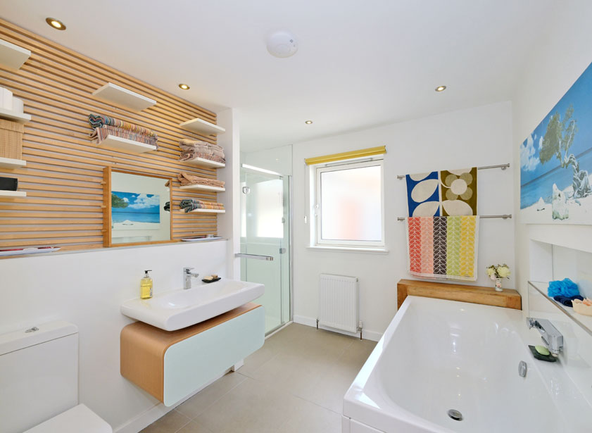 Completing the ground floor accommodation is the bright, modern family bathroom. Fitted with a large bath, walk in shower enclosure which is fully aqua panelled and includes a mains shower appliance, a wash hand basin within vanity unit and WC. Wood panelling with floating shelves above provides extra storage. Electric under floor heating.