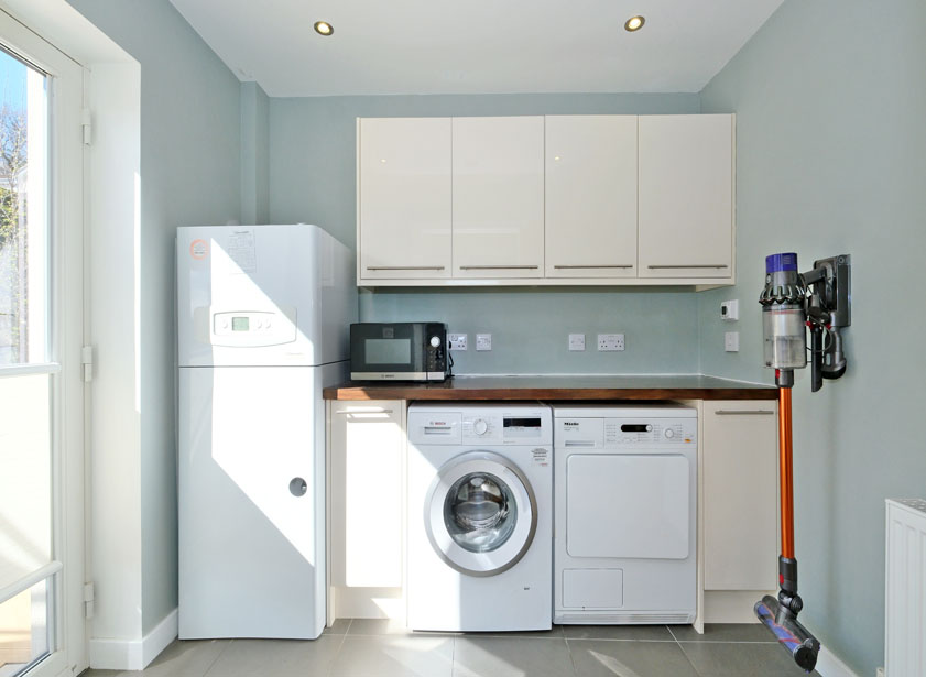 The storage facilities in the dining kitchen are further extended within the utility room. With a glazed door leading out to the rear there is a range of base and wall units, a wood effect roll top work surface, central heating system boiler with mains pressure hot water tank, free standing washing machine and tumble dryer which will be included in the sale.