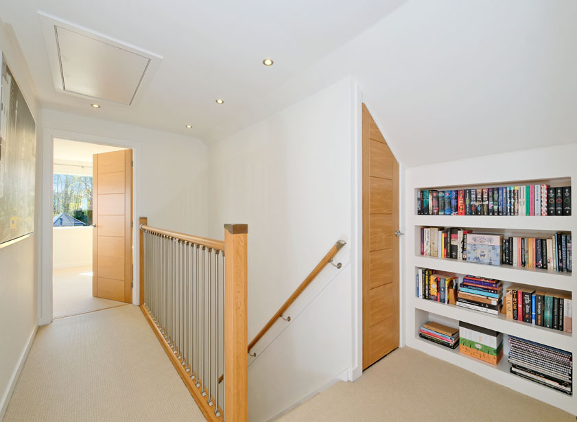 Returning to the reception hall, the carpeted staircase, leads to the first floor. The landing provides access to the attic via a ceiling hatch and built in ladder. A cupboard provides further storage facilities.