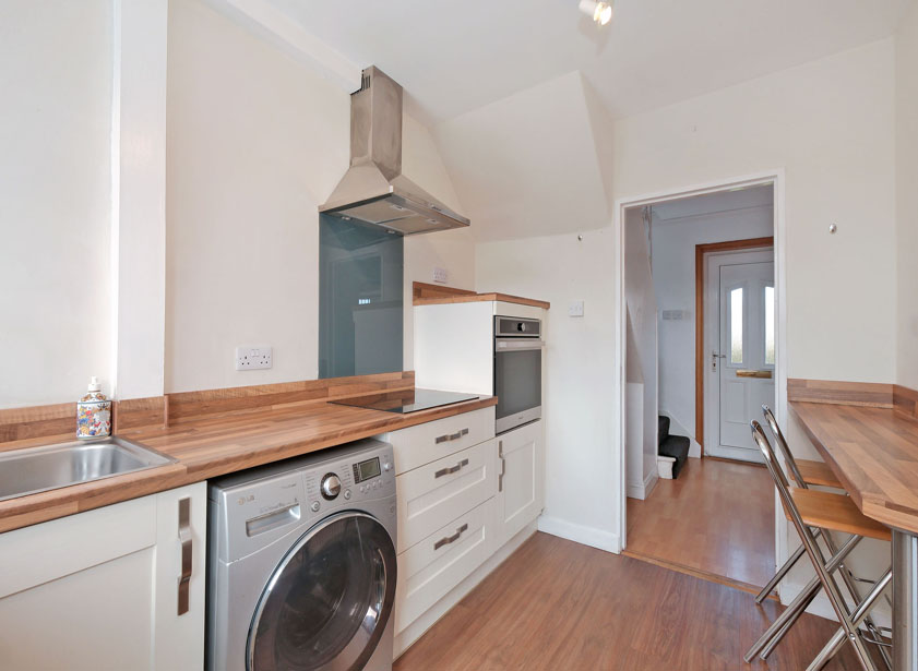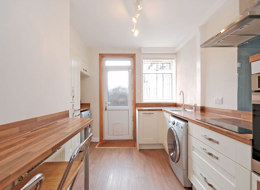 The pleasant dining kitchen overlooks the rear garden, with a partially glazed uPVC door providing access thereto. Fitted with an attractive range of base and wall units, contrasting laminate roll top work surfaces with splashback trim incorporate a stainless steel sink with drainer and a four ring induction hob beneath a stainless steel extractor hood. Within the kitchen there is an integrated slimline dishwasher, fridge/freezer and eye level oven/grill. Further appliances include an undercounter washing machine and tumble dryer, while a fitted breakfast bar area with stools is ideal for informal dining.