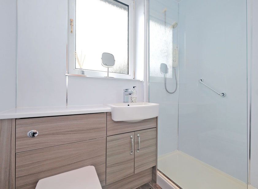 Completing the living accommodation, the contemporary shower room includes a white two-piece which is integral to a vanity unit with storage. The walk-in double shower enclosure houses an electric shower appliance. Further features include ceiling spotlights, a chrome towel rail and a frosted window to the rear which provides plentiful natural light.