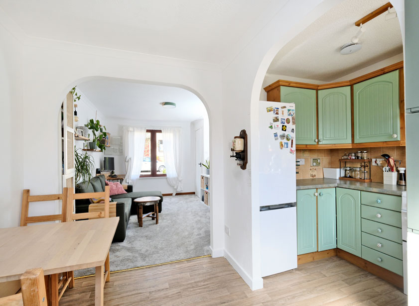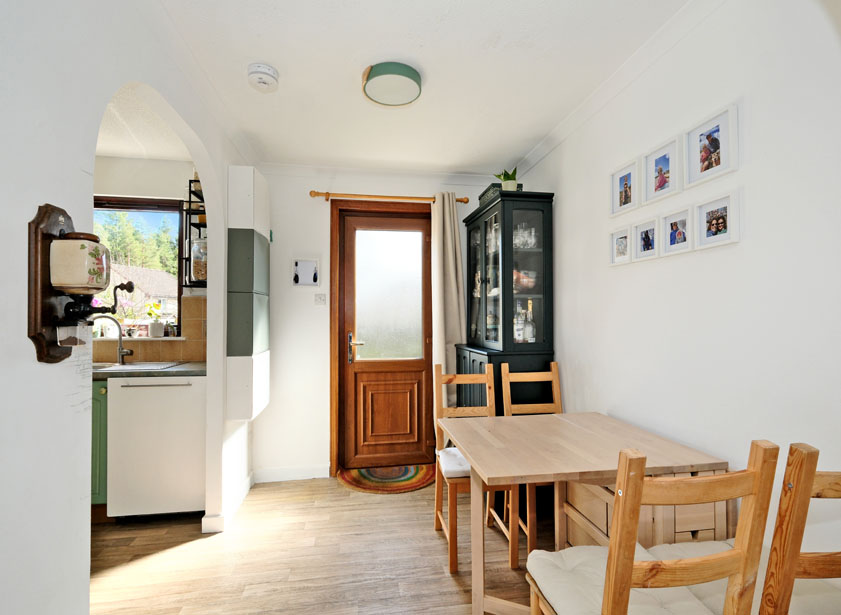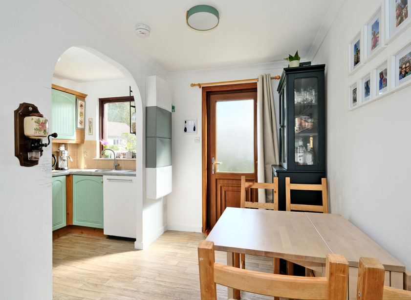 The lounge is a bright room, bathed in natural light from the front and rear and it benefits from a deep, under stair cupboard. An archway provides a partial divide between the lounge and dining area, and another archway allows access from the dining area to the kitchen. A door from the dining area leads out to the garden.