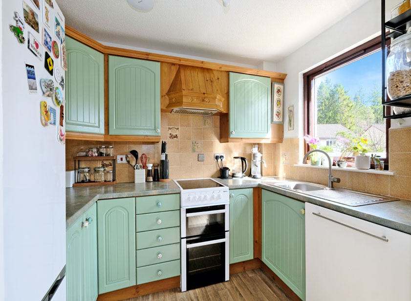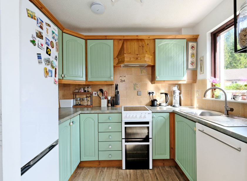 The kitchen is fitted with a range of matte green base and wall units with contrasting worktops incorporating a stainless-steel sink and draining board. There is an electric extractor fan above the free-standing cooker which is to remain and is included in the sale price along with the free-standing fridge-freezer and the free-standing dishwasher.