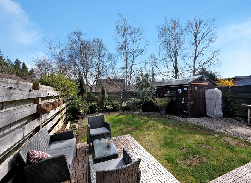 The fully enclosed, south facing rear garden is bordered by wooden fencing with a gate giving access between the front and rear gardens. Mainly laid to lawn, with the remainder being laid to deck, stone chip pathways allow for easy access around the rear garden which contains mature shrubs. There is a garden shed, a bin storage area, an outdoor power point and an outdoor tap.
