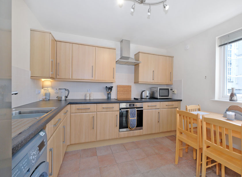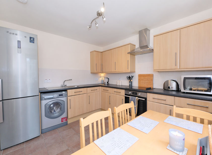 The lounge allows access to the well proportioned and bright dining kitchen, which also overlooks the central courtyard. Fitted with a good range of beech base and wall units with contrasting splash back tiling, the L-shaped laminate roll top work surface incorporates a stainless steel sink with drainer and a four ring induction hob with stainless steel extractor canopy above. Appliances include an integrated oven/grill, under counter washing machine/tumble dryer and a freestanding fridge freezer.