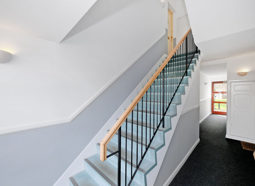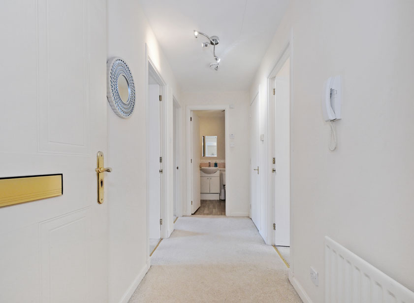Within the communal hall, the apartment entrance door leads into the welcoming reception hall. Of neutral decoration and carpeting, within the hall there is a range of coat hooks in addition to the security entry handset. A fitted storage cupboard accessible from within the hall also houses the elevated hot water cylinder.