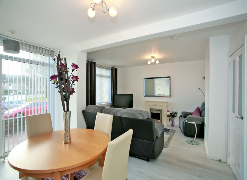 Overlooking the rear of the property there is the open plan lounge/dining room. A versatile and comfortable room of neutral decoration and laminate wood effect flooring, this living space is perfect for both formal dining and relaxation. A contemporary electric fire is central to the lounge, while sliding glazed doors within the dining area provide lots of natural light and access to a small paved terrace beyond.