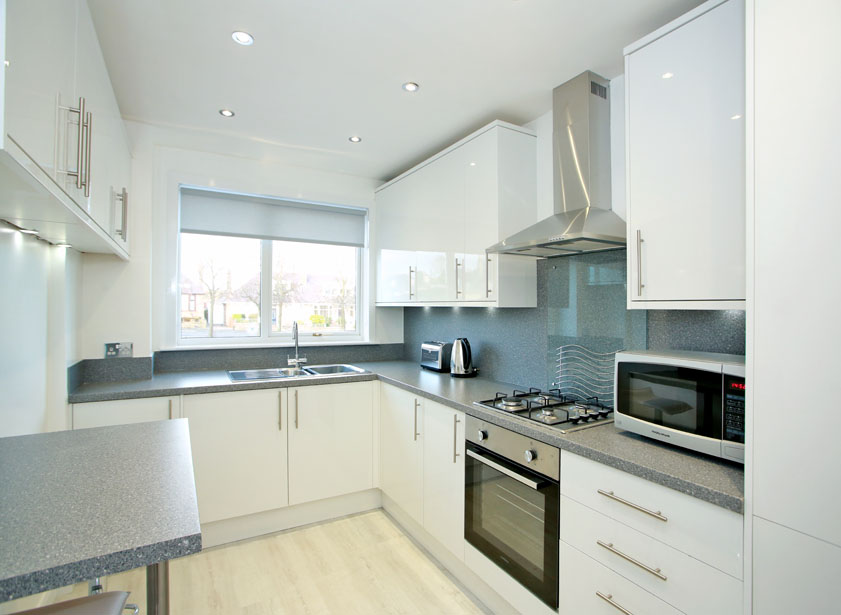 The contemporary dining kitchen overlooks the property frontage. Featuring a good range of white gloss base and wall units with under unit lighting, contrasting work surfaces with matching splashback incorporates a 1.5 stainless steel sink with drainer and a four ring gas hob with stainless steel extractor canopy above. Within the kitchen there is a range of integrated appliances, including a combination washing machine/tumble dryer, oven/grill and fridge/freezer. A well appointed breakfast bar with stools is perfect for informal dining. Further features including laminate wood effect flooring and ceiling spotlights.