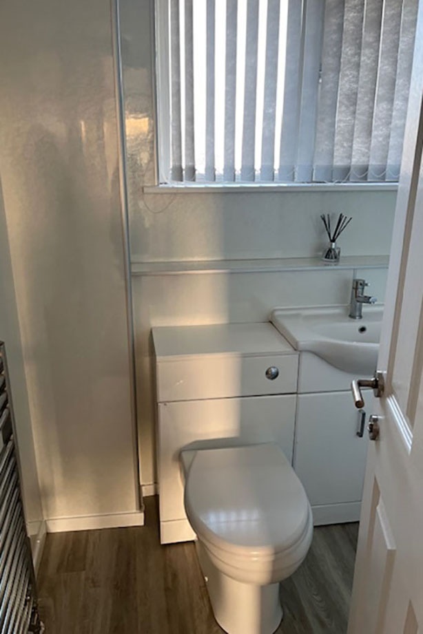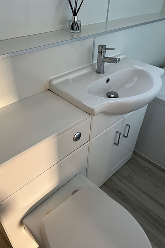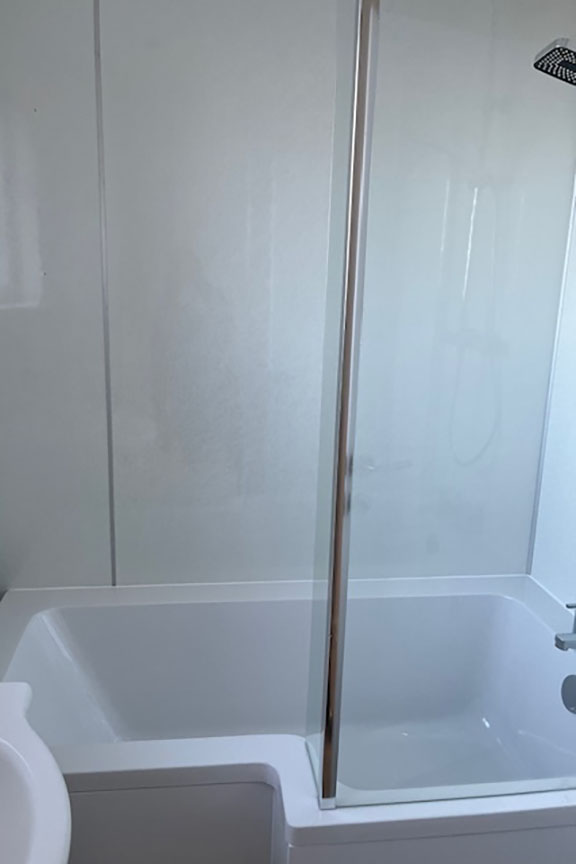 Completing the living accommodation is the contemporary bathroom which is fully aqua panelled. Inclusive of a white three piece suite, above the P-shaped bath is a mains shower appliance and glazed shower screen. A white gloss vanity unit incorporates the WC and wash hand basin. An elevated frosted window to the front of the property provides natural light.